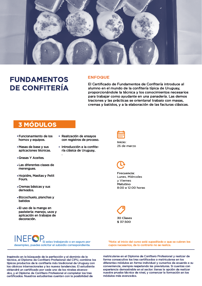 Inspirado en la búsqueda de la perfección y el dominio de la técnica, el Diploma de Confitero Profesional del CIPU, combina los típicos productos de la confitería más tradicional de Uruguay con los clásicos internacionales y las nuevas tendencias. El estudiante obtendrá un certificado por cada uno de los niveles alcanzados, y el Diploma de Confitero Profesional al completar los tres certificados. Nuestros estudiantes cuentan con la posibilidad de matricularse en el Diploma de Confitero Profesional y realizar de forma consecutiva los tres certificados o matricularse en los diferentes módulos en forma individual y cursarlos de acuerdo a su conveniencia, siempre respetando las previaturas. Si cuentas con experiencia demostrable en el sector, tienes la opción de realizar nuestra prueba técnica de nivel, y comenzar la formación en los módulos más avanzados.